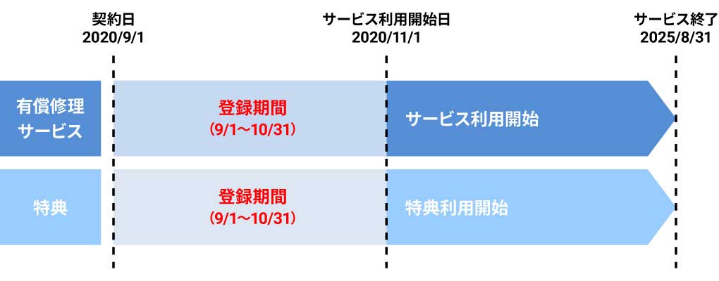 - 特典対象機器で修理が行えない場合は対応不可となり、交換品の対応はございません。